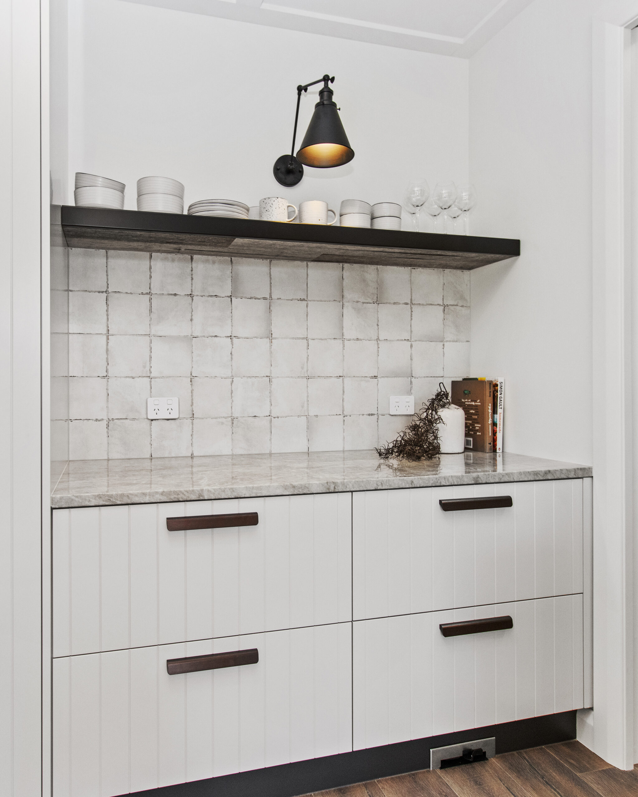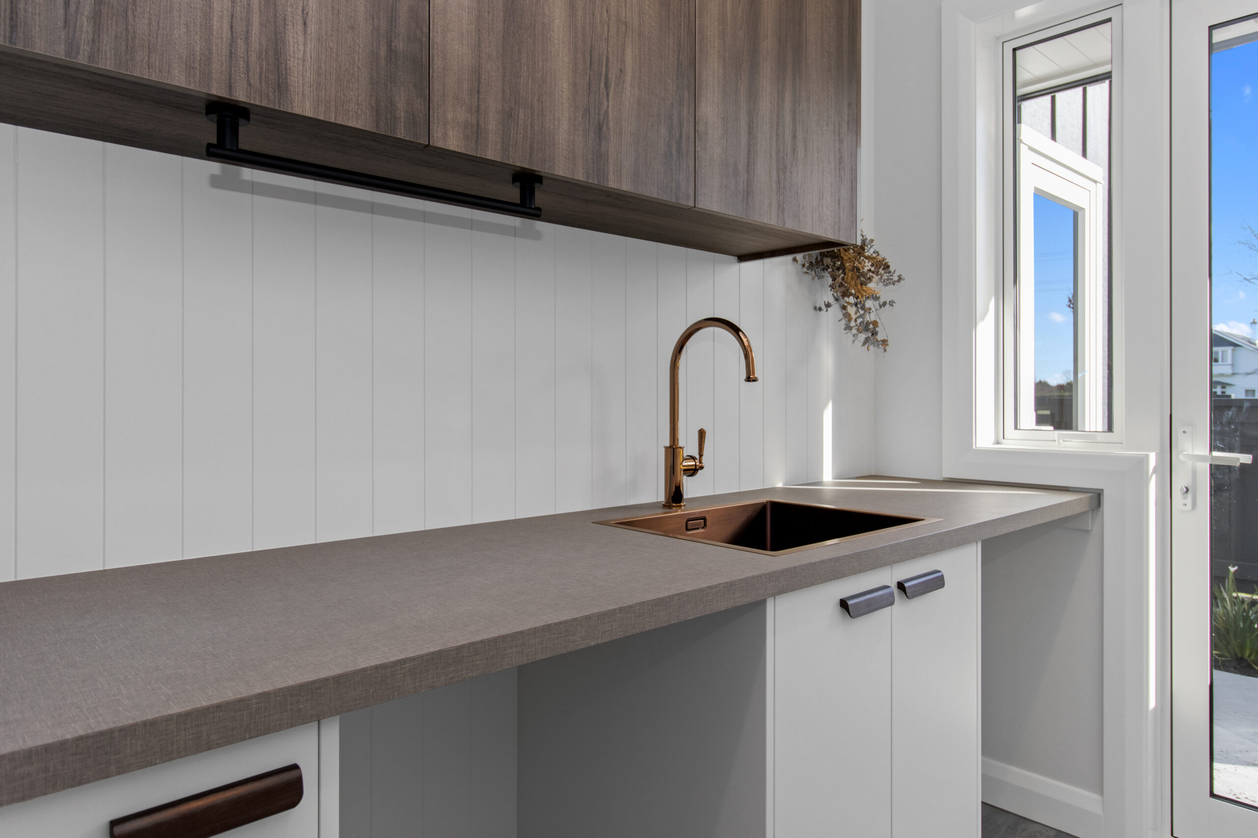 • Melamine cabinetry and engineered stone tops to kitchen and scullery