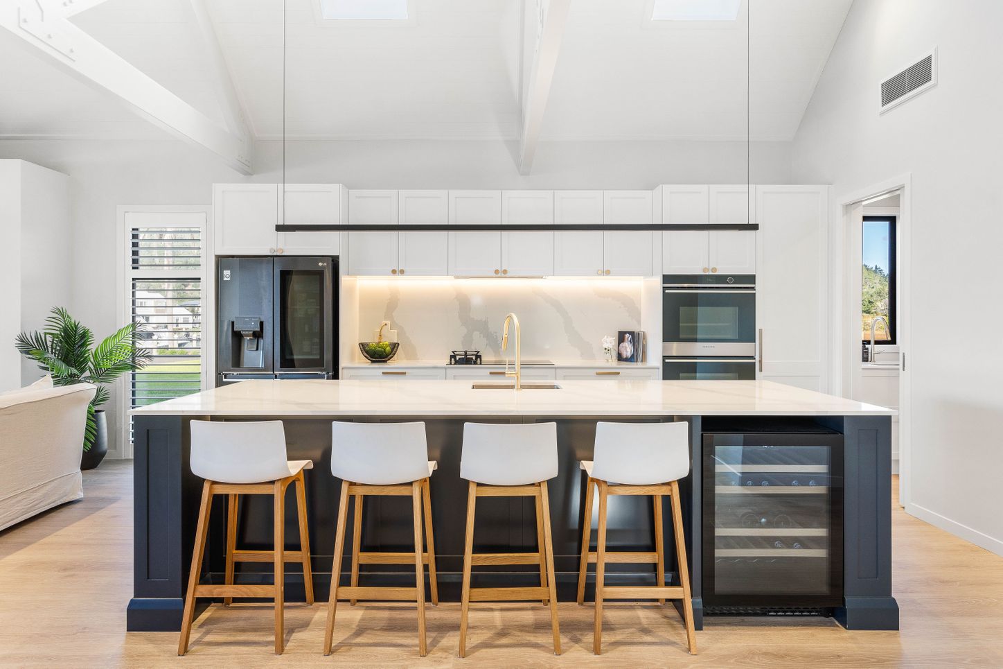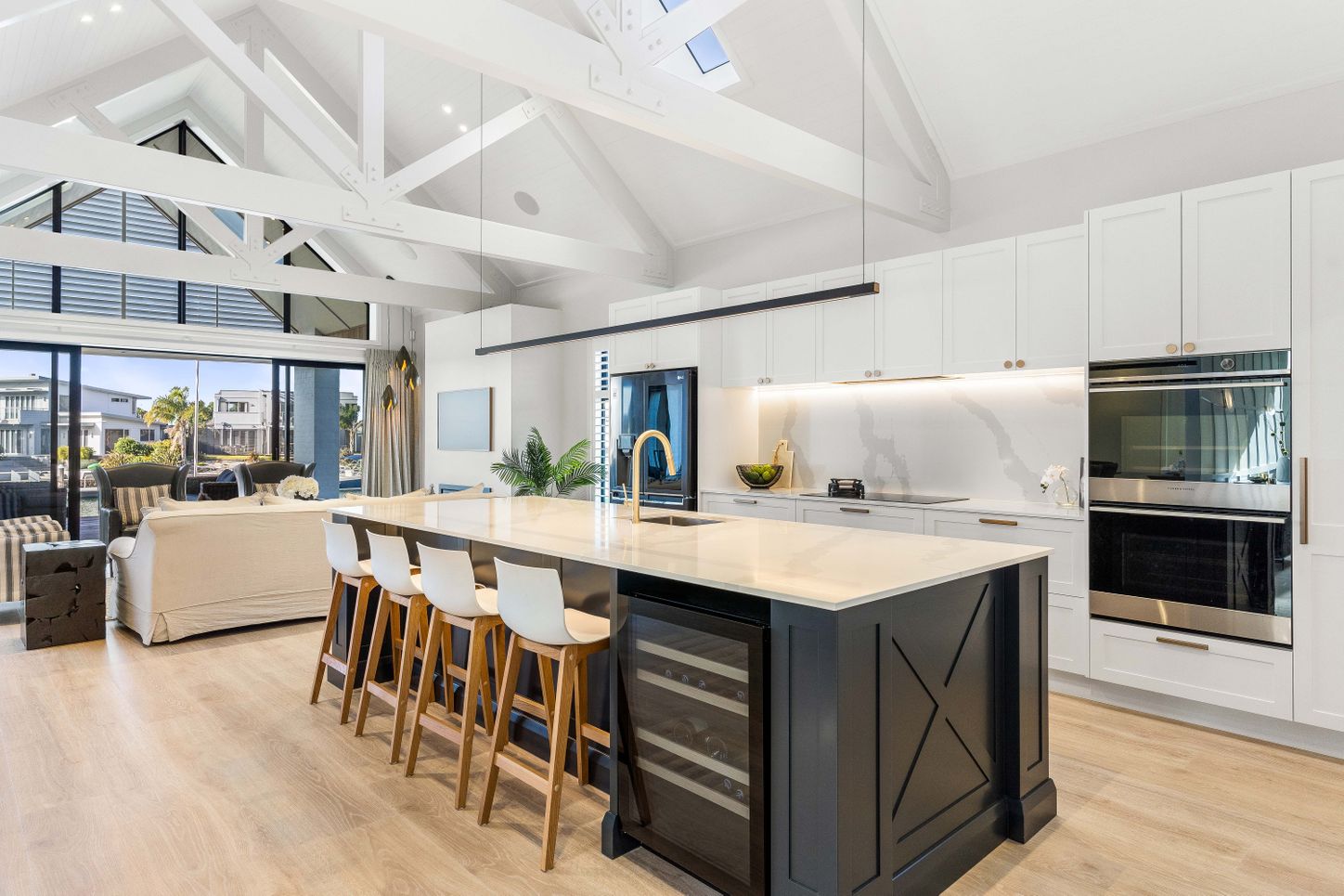 At the heart of the home is an expansive open-plan living area, flowing seamlessly to the outdoors via corner-opening sliders. The covered alfresco space – complete with an electric-opening Lourvetec roof – allows for year-round gatherings, whether it’s a summer barbecue or a cosy winter dinner.